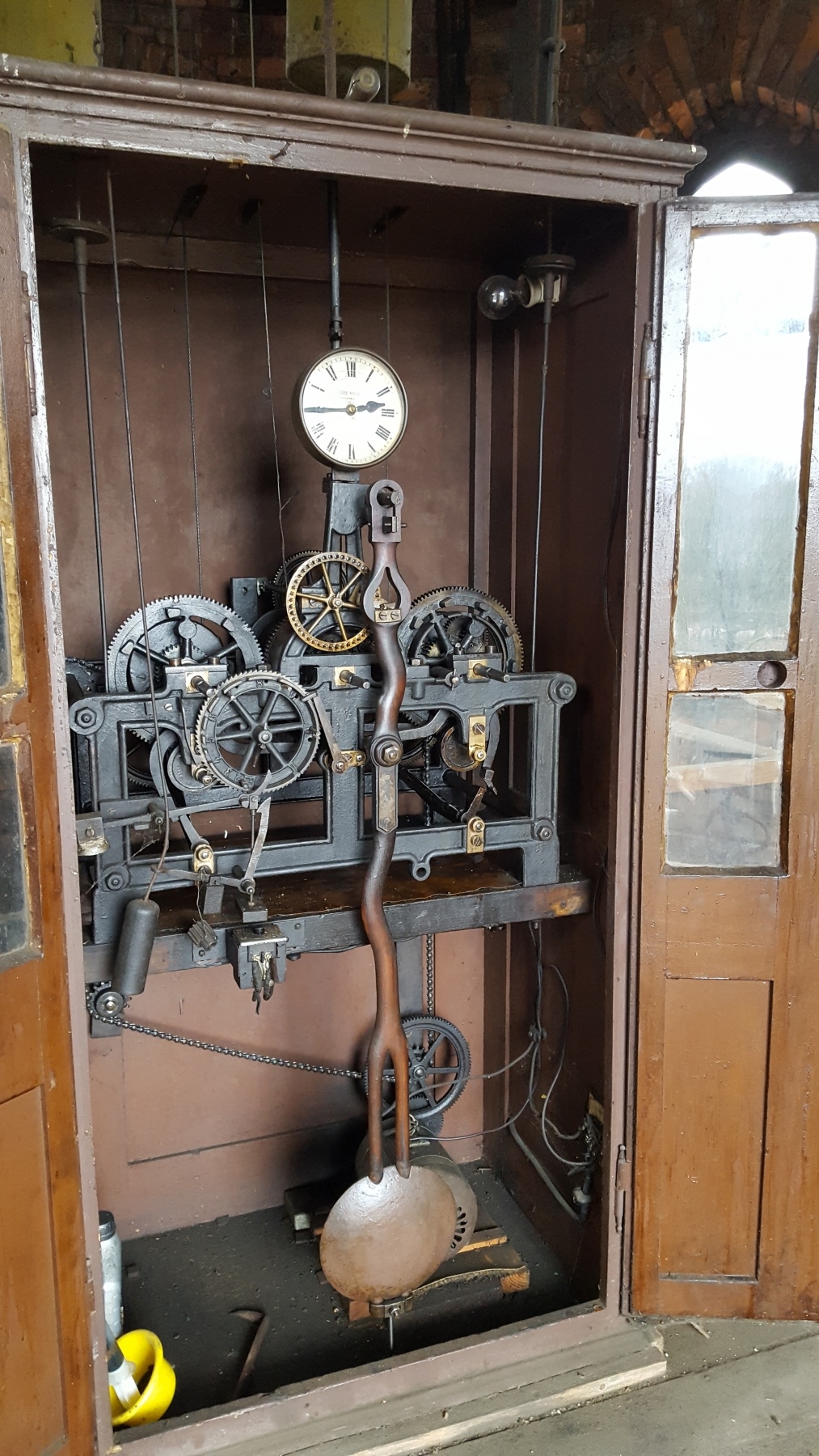 Elektryczny naciąg wag zbudowano w oparciu o walcowe przekładnie planetarne, zamontowane na linowych bębnach napędowych poszczególnych trzech mechanizmów zegara. Wszystkie bębny spięto za pomocą przekładni z łańcuchem Galla oraz napędzono reduktorem z jednofazowym silnikiem elektrycznym. Mechanizm zegara znajduje się w oryginalnej szafie ochraniającej go przed zanieczyszczeniami.